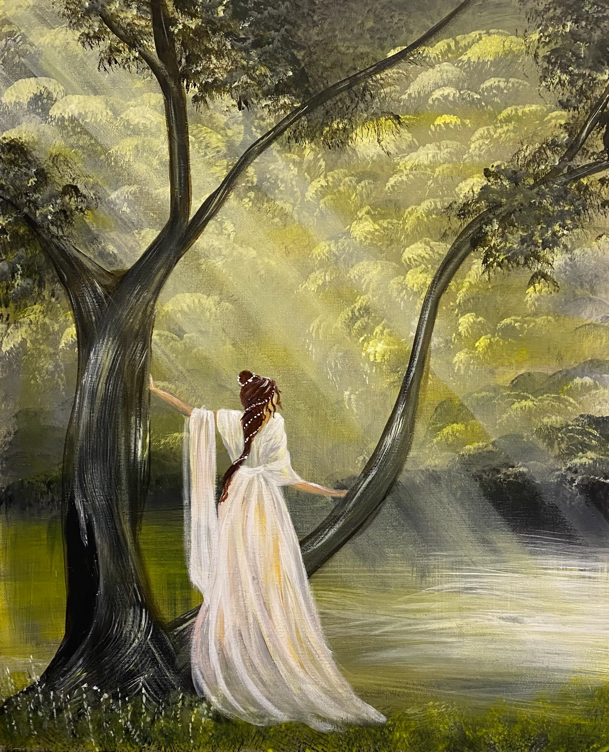 This painting captures the poetry of solitude — the peace of walking barefoot on golden sands, the whispers of the tide, and the freedom of being suspended between earth and sky.