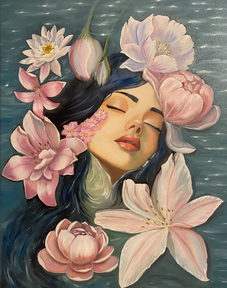 This piece captures the essence of harmony between feminine beauty and nature’s quiet power — a vision of serenity where the soul blooms as gracefully as the flowers themselves. A woman’s face emerges in tranquil stillness, her eyes closed as though surrendering to a dream. Dark flowing hair merges with water, becoming a cradle for blossoms that unfurl around her like whispers of renewal. Soft pink lotuses and lilies surround her, symbols of purity, transformation, and rebirth.
