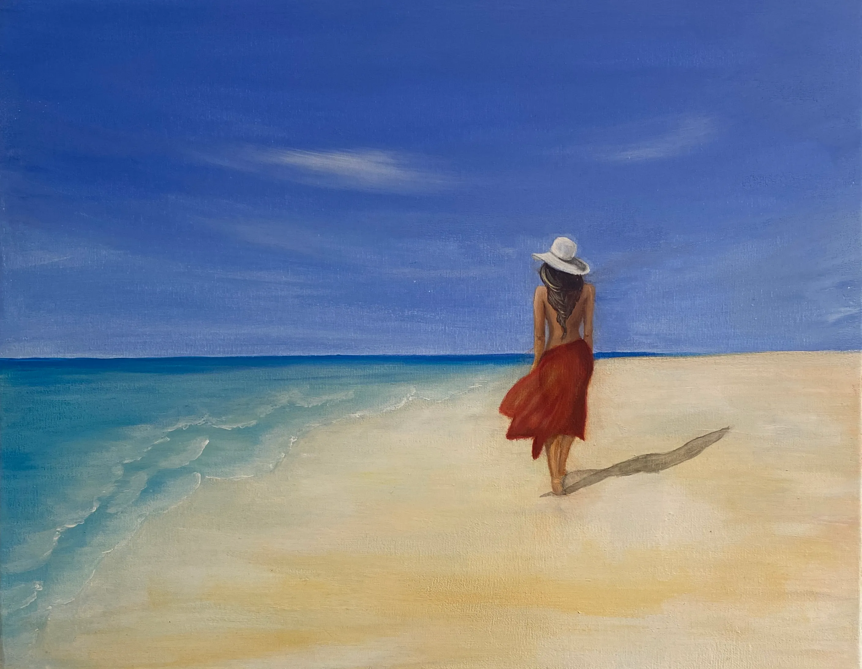 A lone figure strolls along the shoreline, her white sunhat and flowing red skirt caught gently by the breeze. The vastness of the sky and sea stretches endlessly before her, painted in serene shades of blue that blend into the horizon. Her shadow trails softly across the sand, grounding her presence in this moment of quiet reflection.