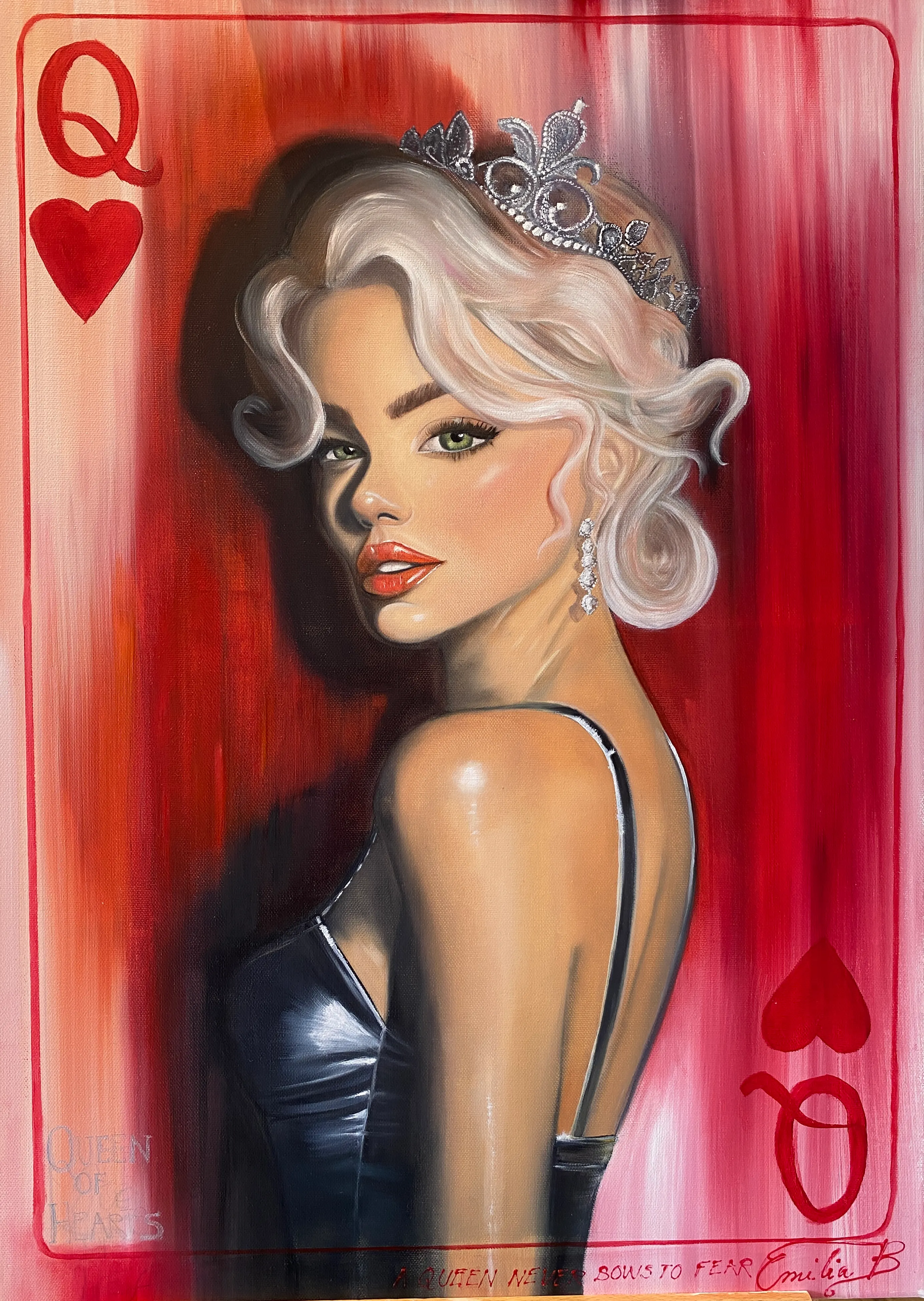 Bathed in crimson light, she reigns with elegance and defiance. Her crown glimmers like starlight, yet her true power lies in her gaze — steady, unyielding, alive with fire. She is both allure and authority, beauty and strength, a vision of the Queen of Hearts not as a card to be played, but as a woman who writes her own rules. In satin and shadow, she whispers a truth: A queen never bows to fear.