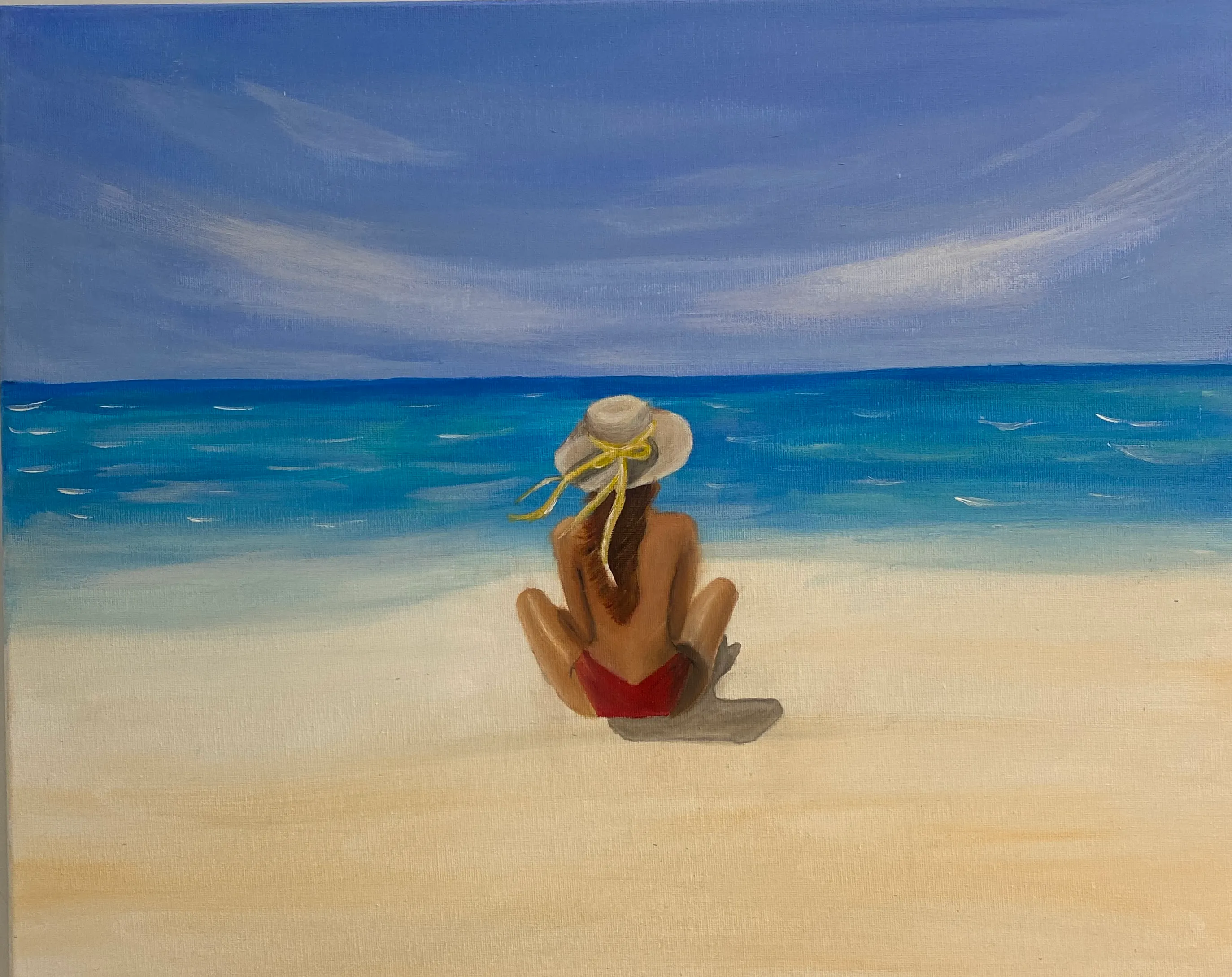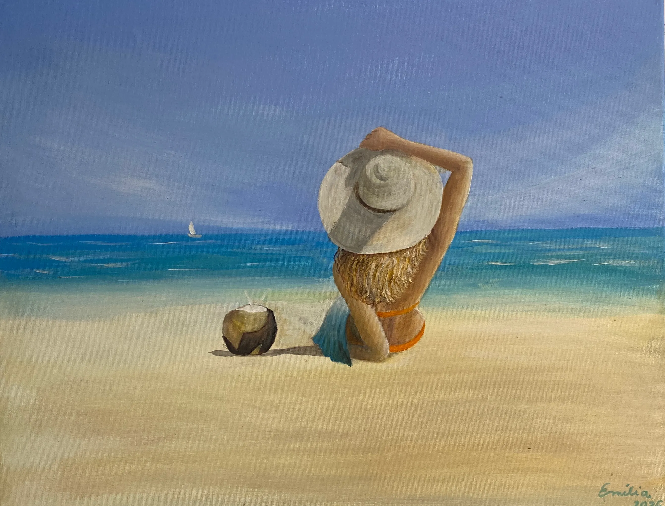 A moment of stillness by the sea—where sky meets horizon and time seems to dissolve. In Summer Breeze, a woman sits bathed in sunlight, her hat kissed by the wind, her gaze lost in the endless blue. This painting is a celebration of freedom, serenity, and the quiet beauty of being present. The warmth of the sand, the rhythm of the waves, and the embrace of the breeze invite you into a world where simplicity becomes profound.