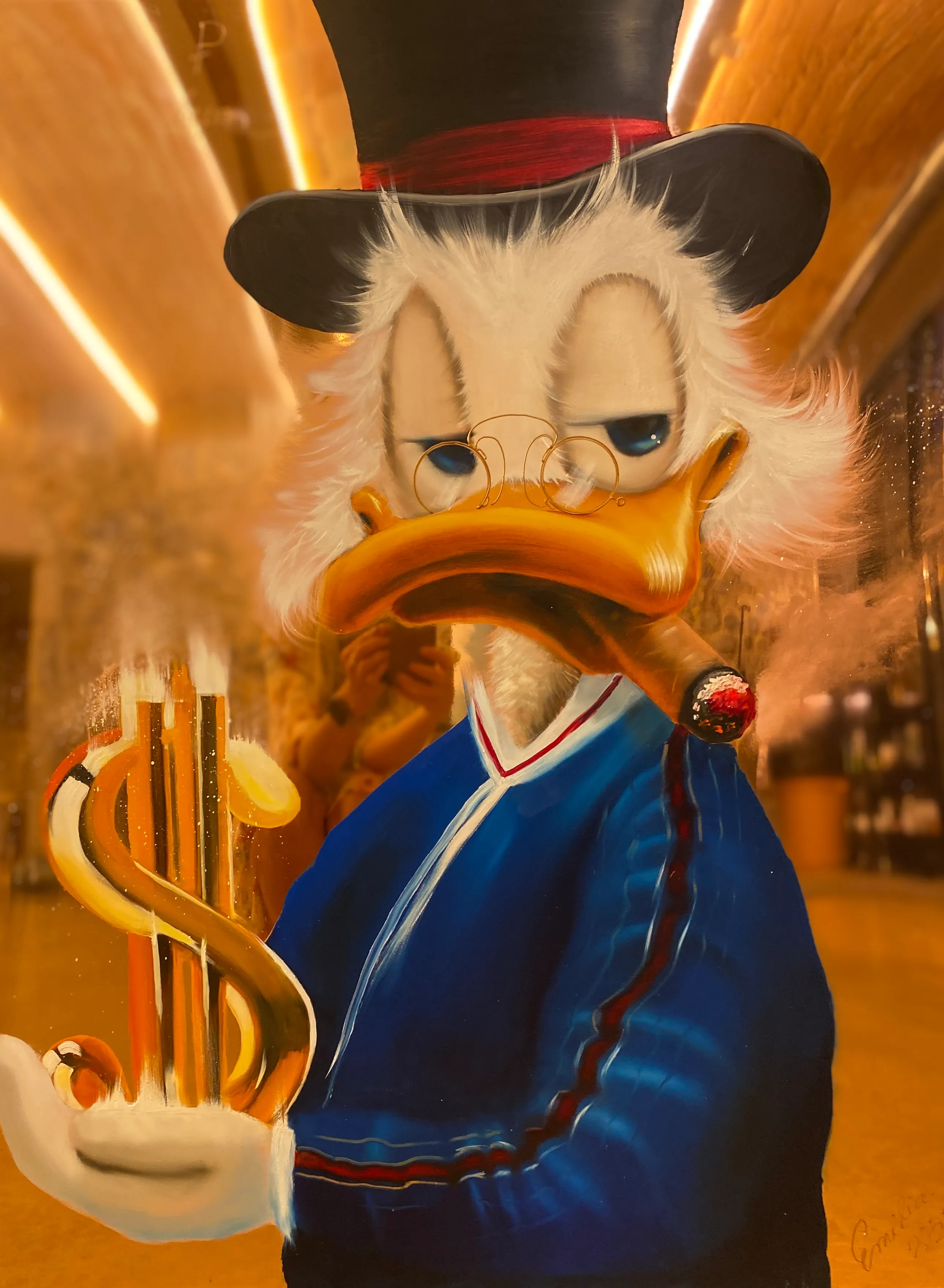 This piece blurs the line between pop culture and fine art, holding a mirror to society’s fascination with money, status, and power. At once playful and provocative, it is a commentary on the character we all recognize, yet also a reflection of the world we inhabit.