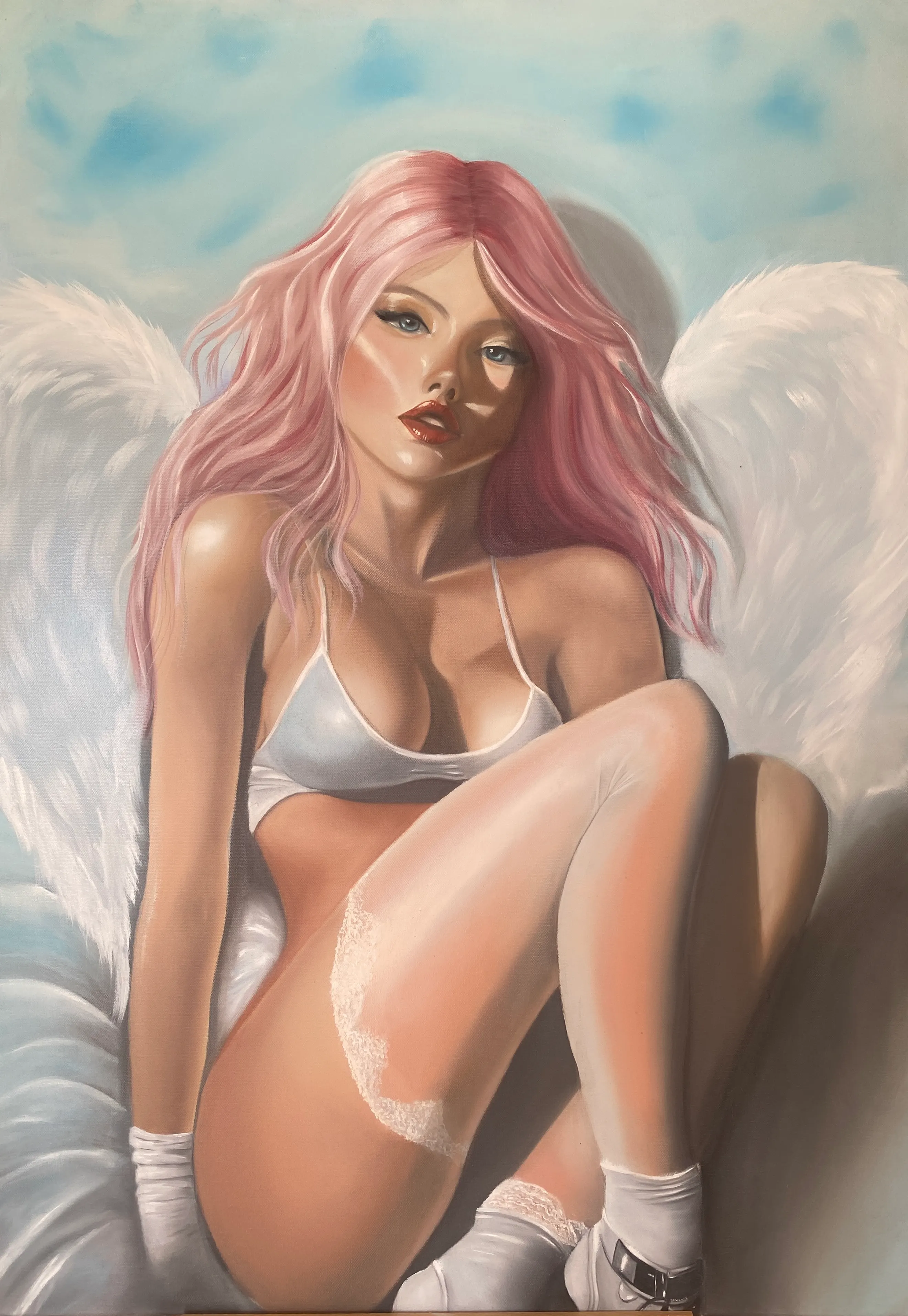 Bathed in soft light, she rests upon clouds, her wings unfurled like whispers of divinity. Her gaze is distant, caught between mortal longing and celestial grace, as if she belongs to both heaven and earth, yet fully to neither. Her pink hair flows like twilight’s last glow, and her form radiates a tender strength— a vision of desire wrapped in innocence, a dream made flesh beneath an endless sky.